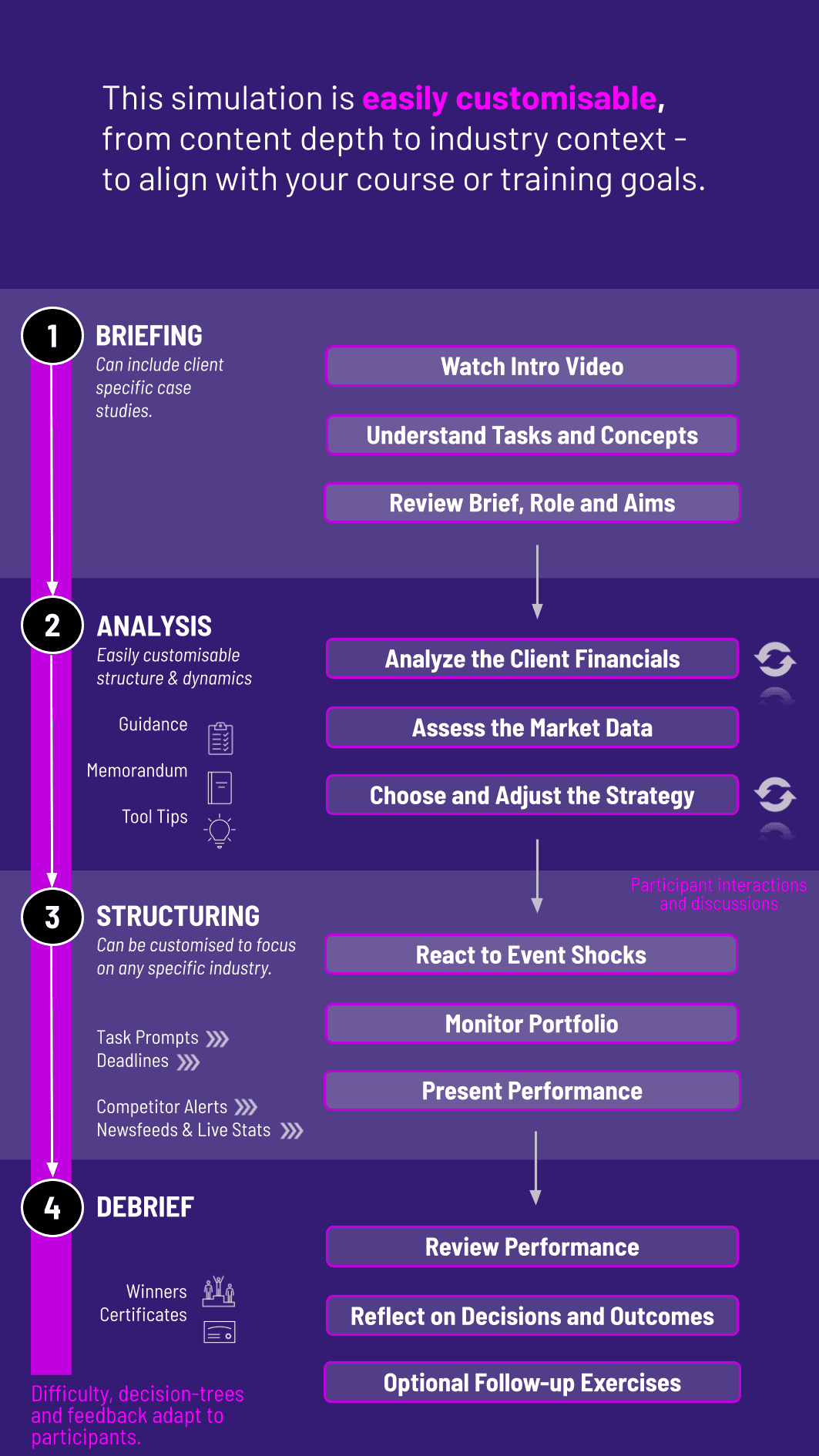 Can the simulation scenario be customized? Absolutely. Instructors can tailor the client objectives, market conditions, available investment products, and the specific concepts emphasized to fit their curriculum or training goals.