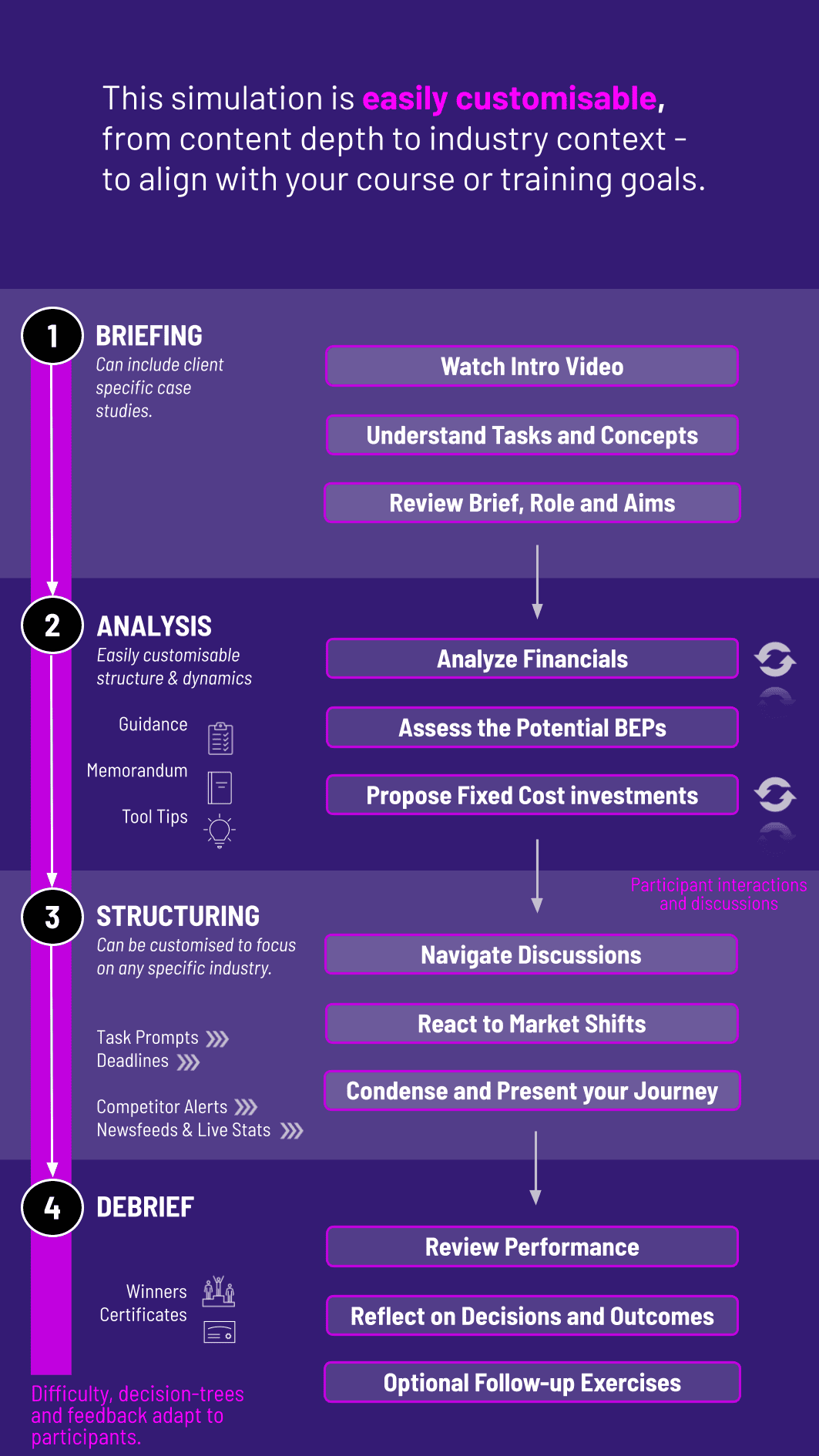 4. Results and Feedback Participants receive a detailed financial dashboard and report showing their P&L, cash flow, current break-even point, and market share.