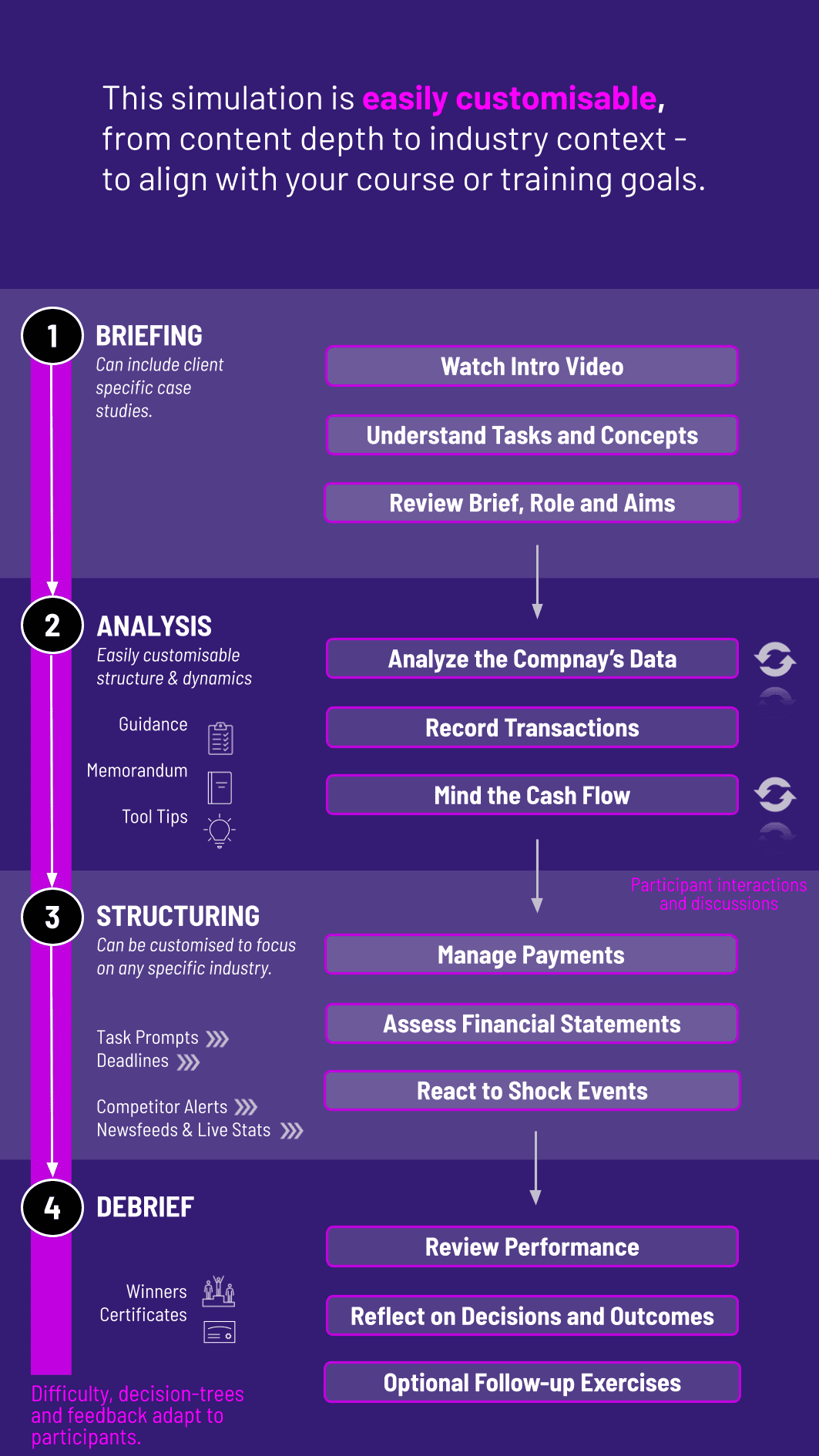 Do participants need an accounting background? No prior accounting knowledge is strictly necessary. The simulation is designed to be intuitive and teaches the core concepts of cash accounting from the ground up, making it accessible to a wide audience.