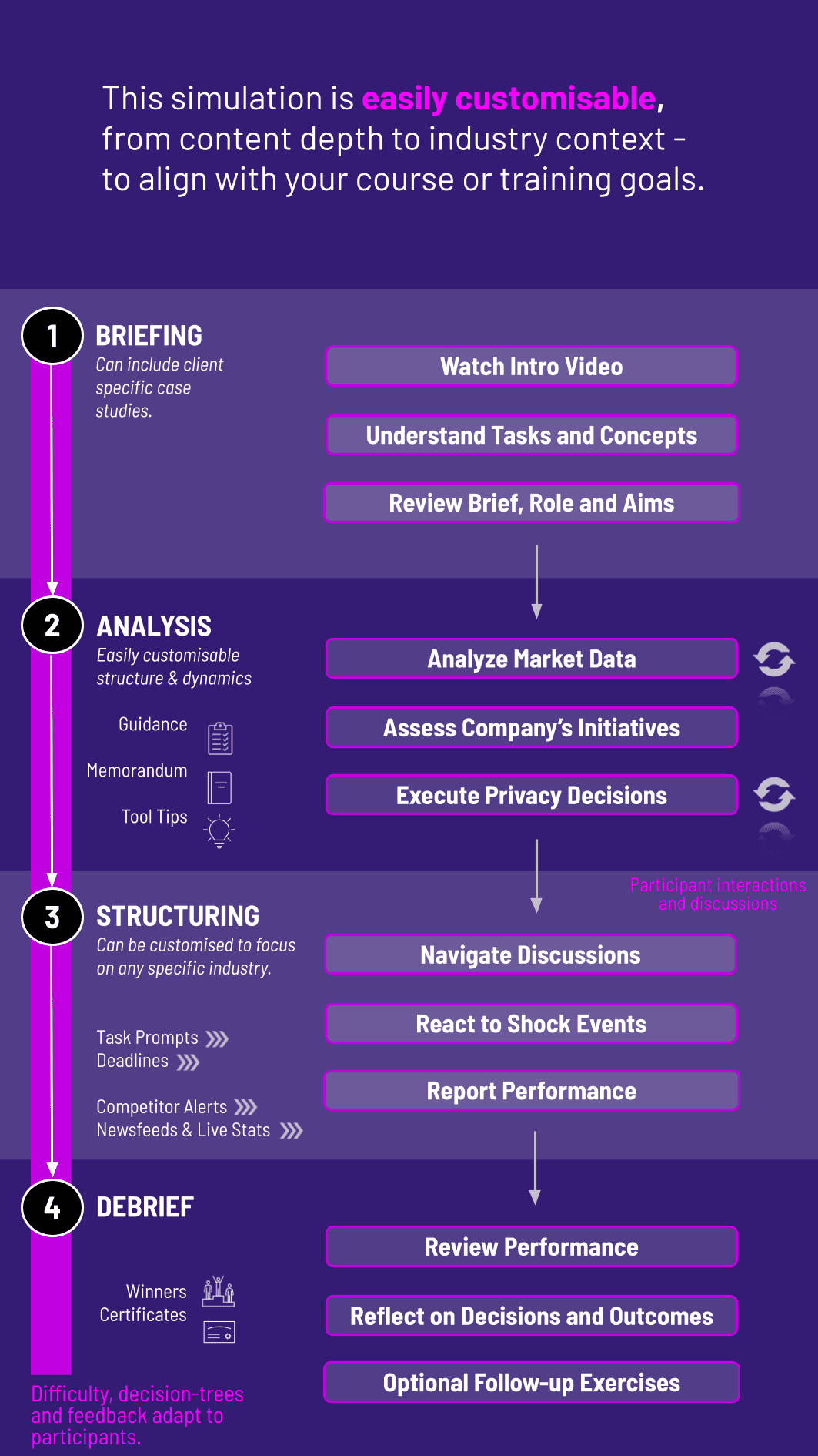 Can instructors customize the simulation? Absolutely. Scenario focus (e.g., emphasis on marketing vs. fintech), regulatory jurisdiction, and organizational context can be tailored to specific audiences.