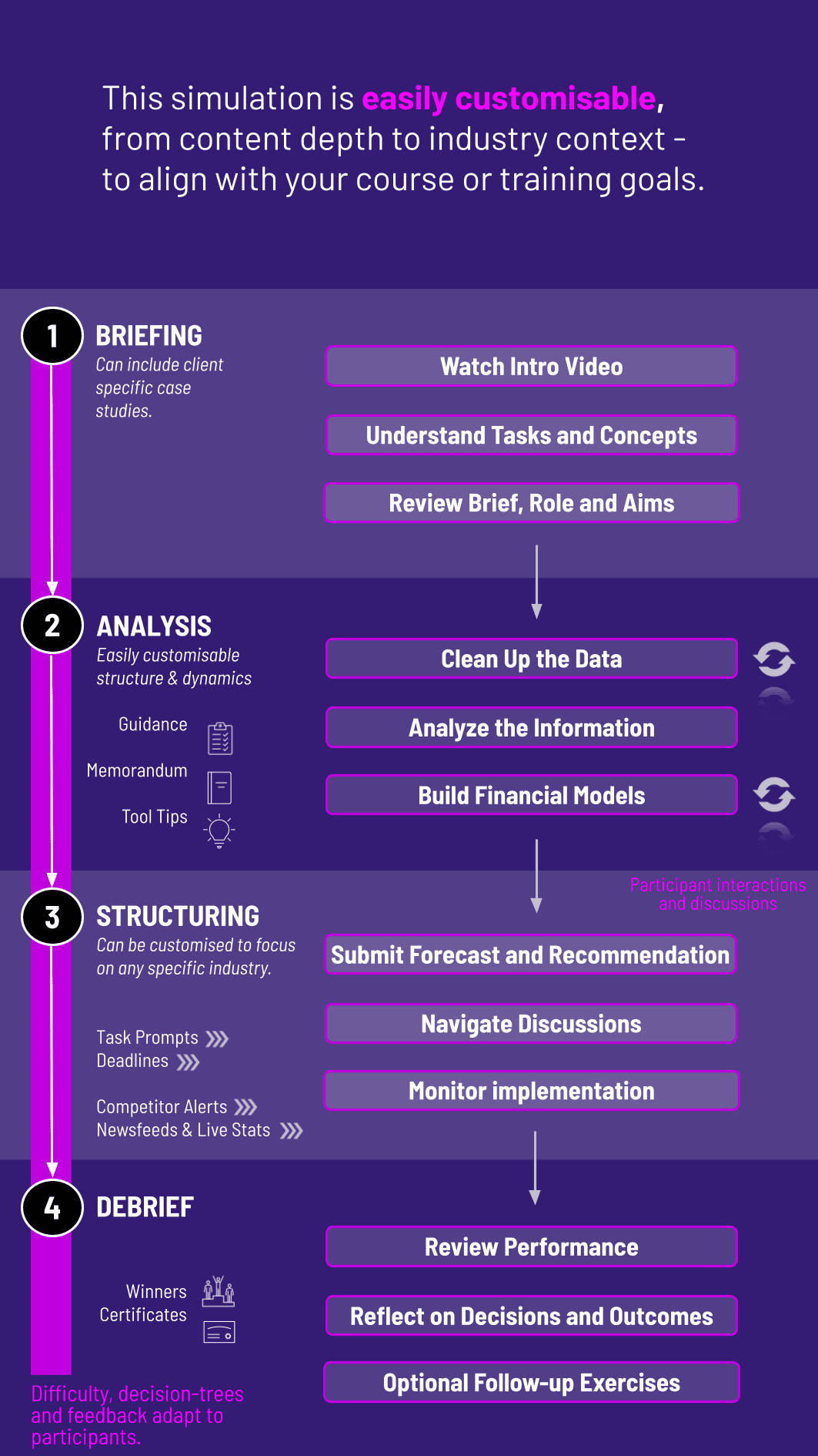 How long does the typical Financial Data Analytics Simulation run? Programs can be tailored from intensive 1-2 day workshops to multi-week university courses. A typical format involves 4-6 decision rounds, allowing for deep skill development and iterative learning.