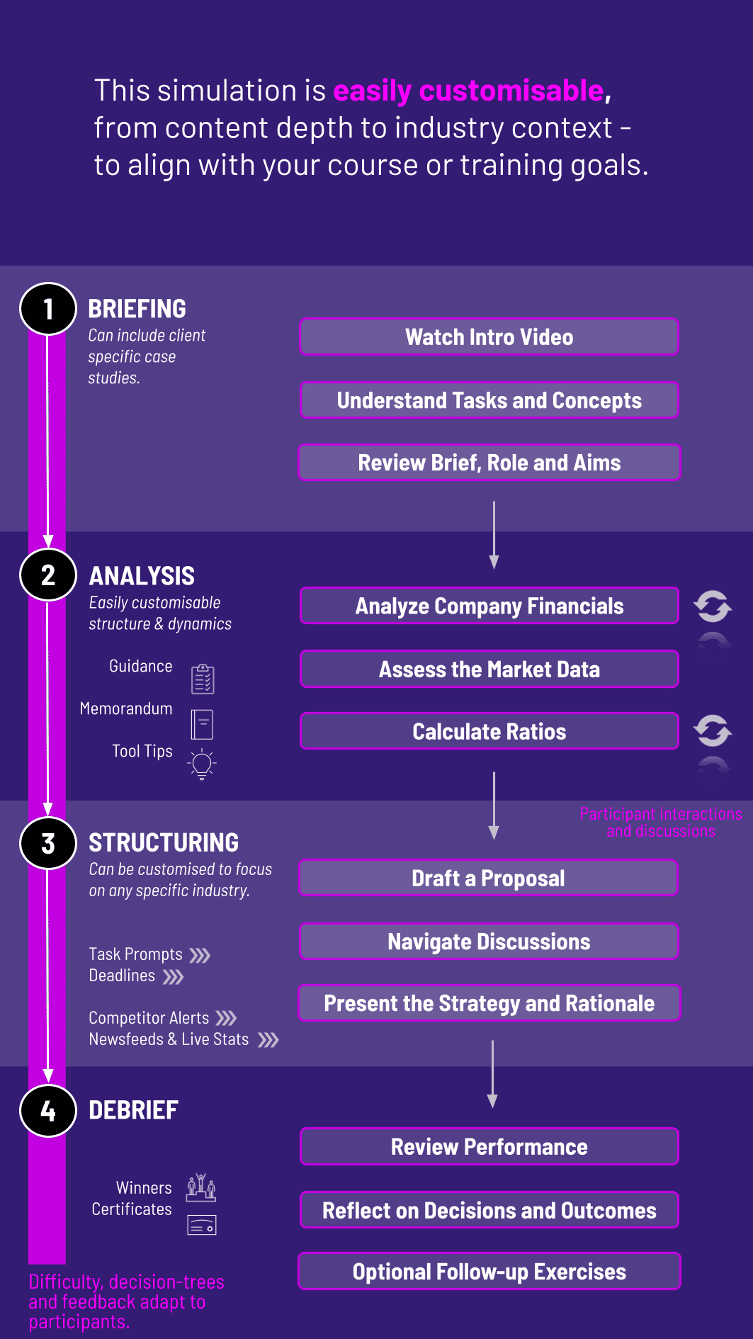 Do participants work individually or in teams? The simulation supports both individual and team-based participation. We often recommend teams of 3-4 to encourage collaboration, debate, and the development of a consensus-based investment recommendation.