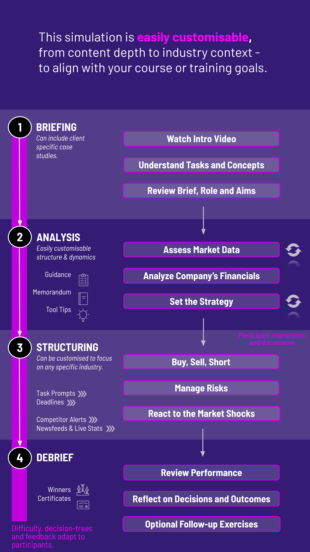 How long does a typical simulation last? A full simulation can be run as a multi-week course module or an intensive 1-2 day workshop, typically involving 6-8 decision rounds.