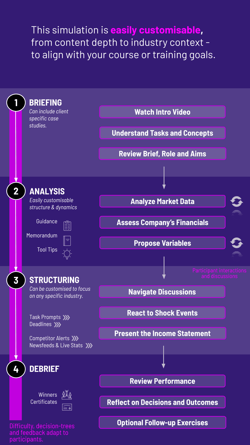 Is the simulation individual or team-based? It is designed primarily for teams to mimic real-world management collaboration, but it can also support individual participation to focus on personal decision-making skills.
