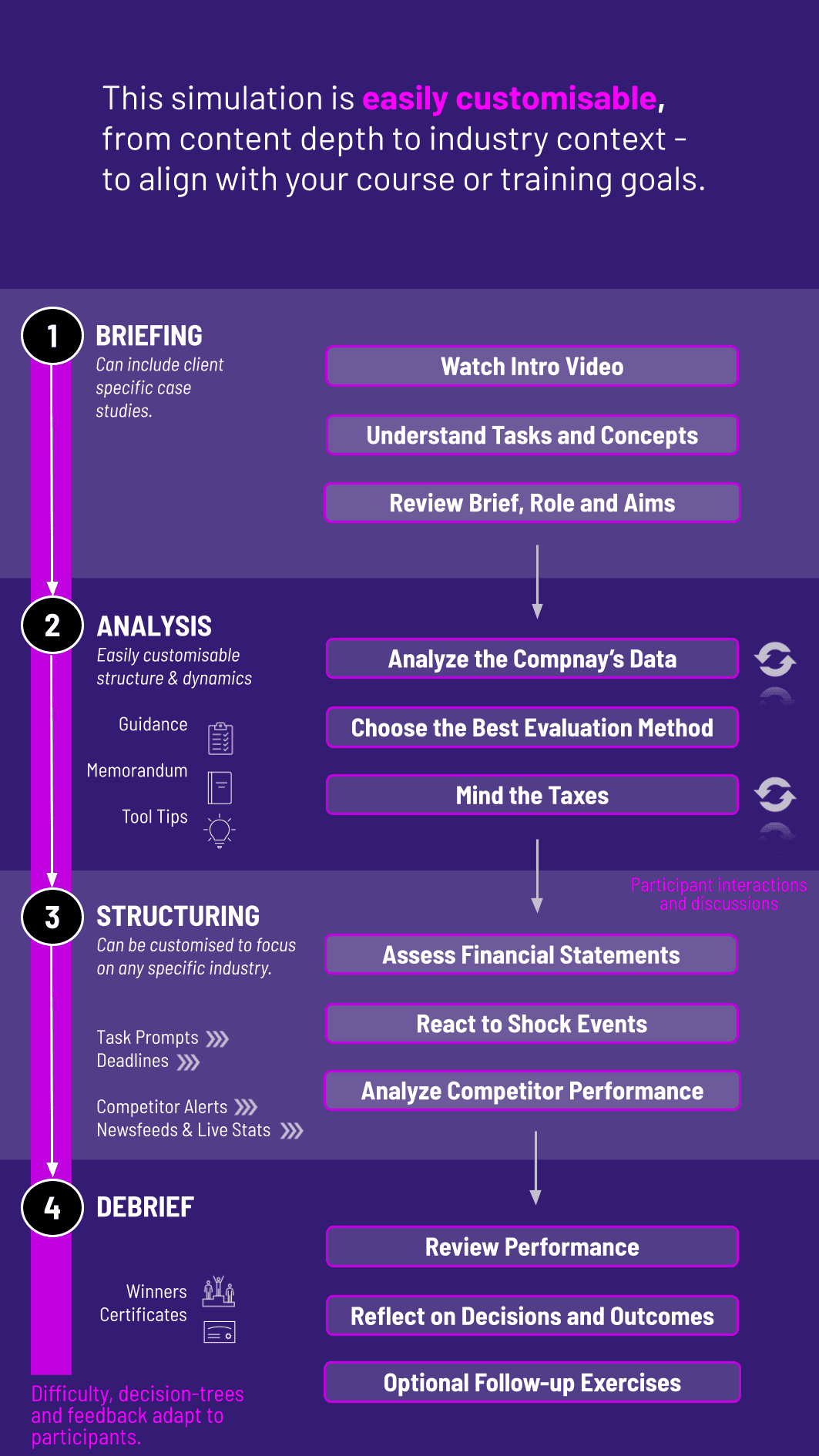 5. Debriefing An instructor-led debrief connects the simulation experience to accounting theory, highlighting the "why" behind the financial results and facilitating a discussion on strategic implications.