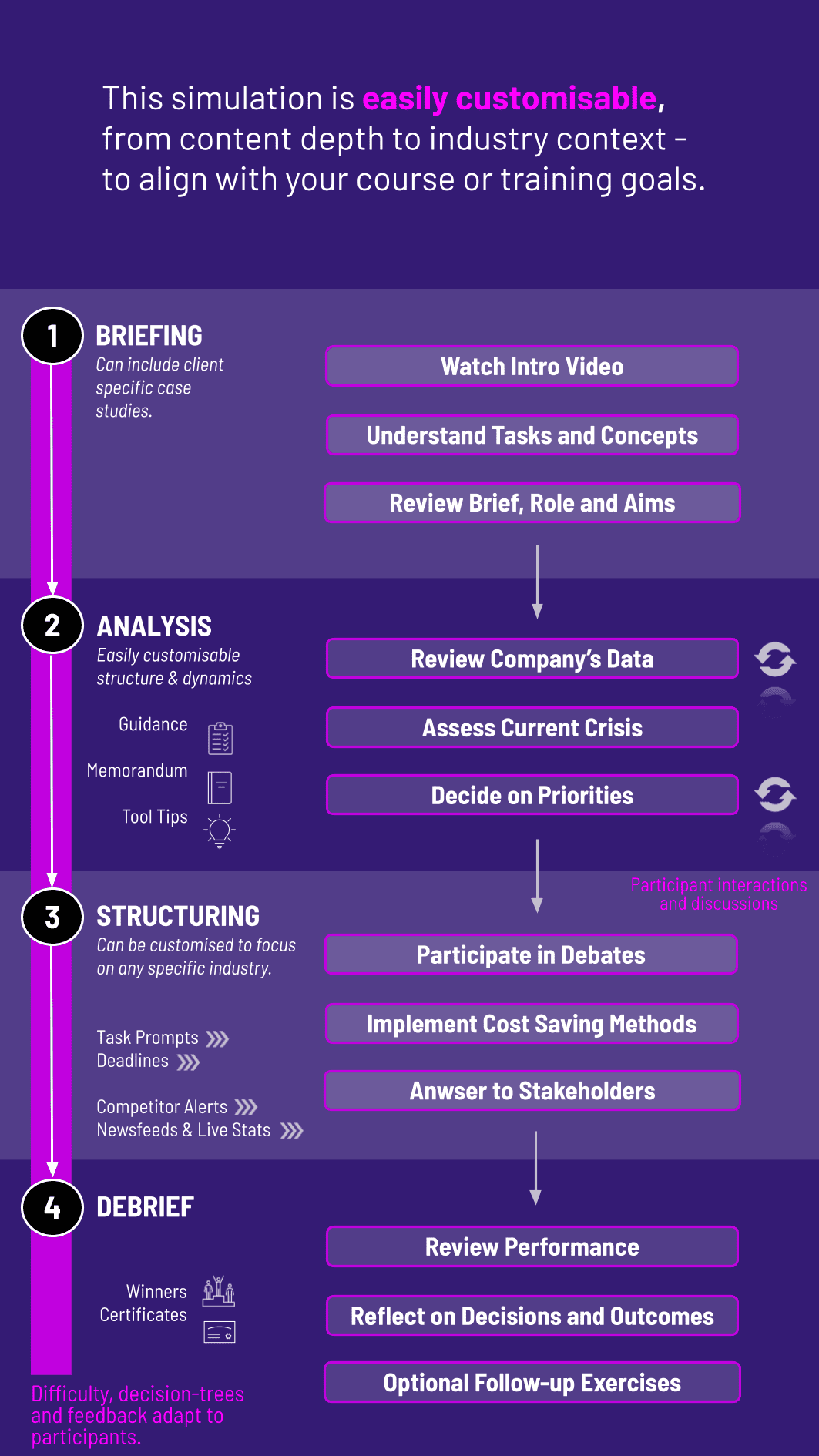 The simulation’s flexible structure ensures that these objectives can be calibrated to match the depth, duration, and focus areas of each program, whether in higher education or corporate learning.