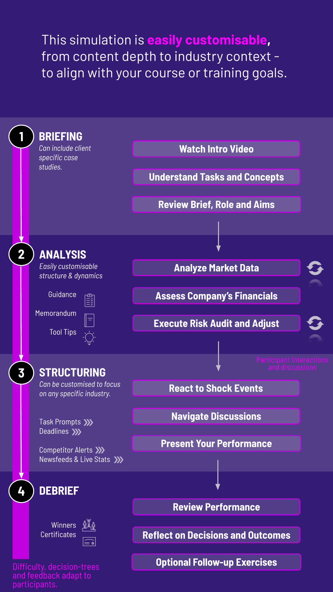 Can instructors customize the simulation? Absolutely. The focus areas, industry context (e.g., banking, manufacturing, tech), and specific risk modules can be tailored to align with course or training objectives.