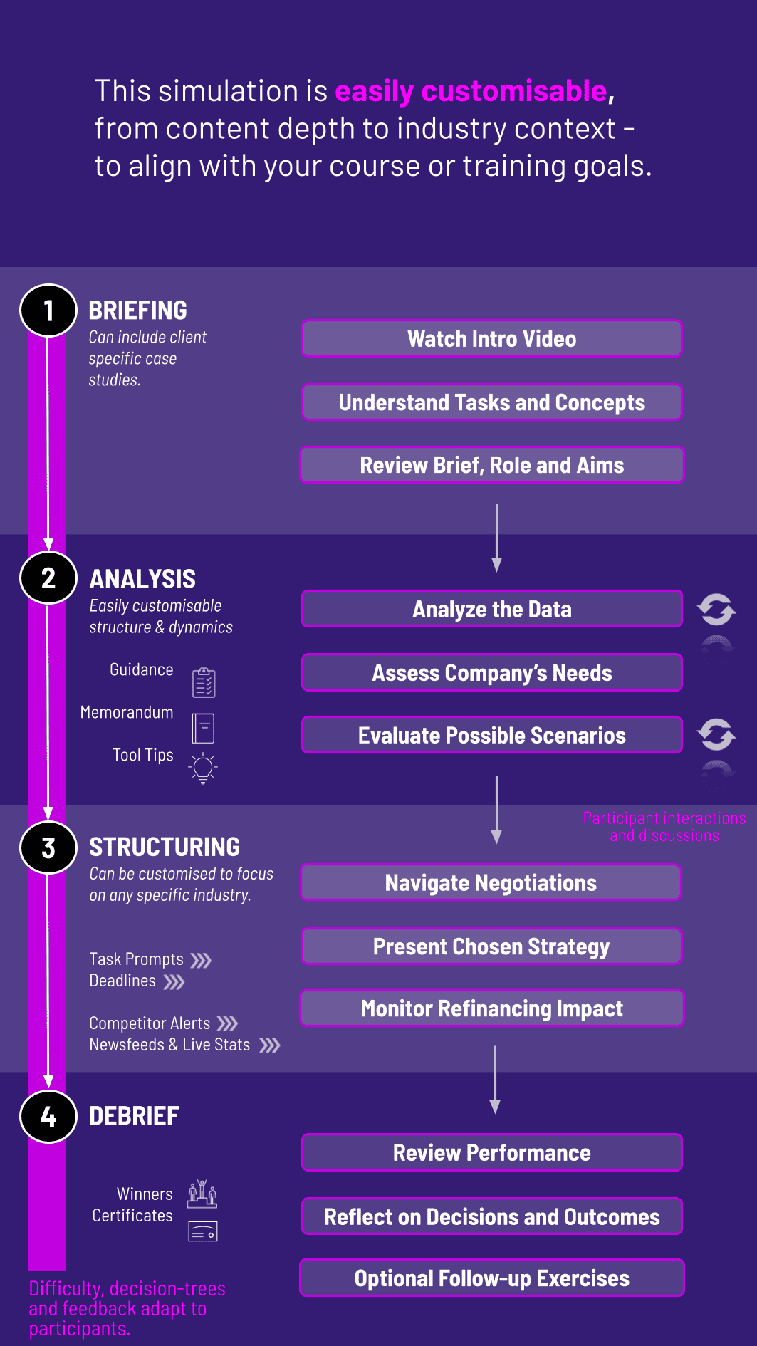 4. Execution and feedback The rounds simulate evolving market conditions, rate shifts, and covenant tests. Immediate feedback focuses on financial outcomes, risk management, and communication quality.