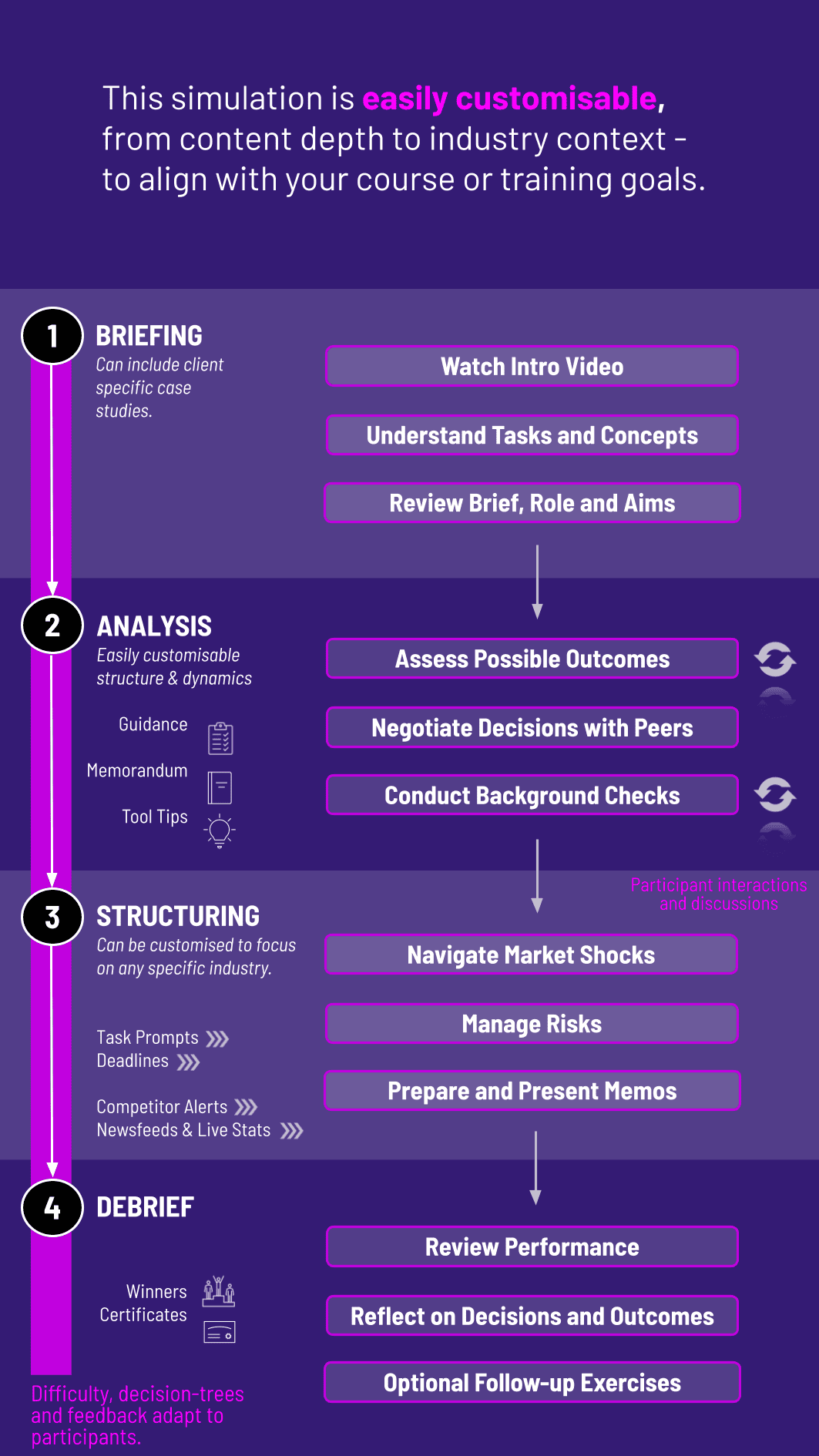 The simulation’s flexible structure ensures that these objectives can be calibrated to match the depth, duration, and focus areas of each program, whether in higher education or corporate learning.