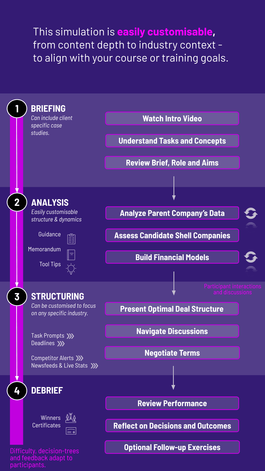 Do I need prior experience in M&A or investment banking? While helpful, it is not required. The simulation is designed with learning modules and guidance to bring participants up to speed on the core concepts before they begin making critical decisions.