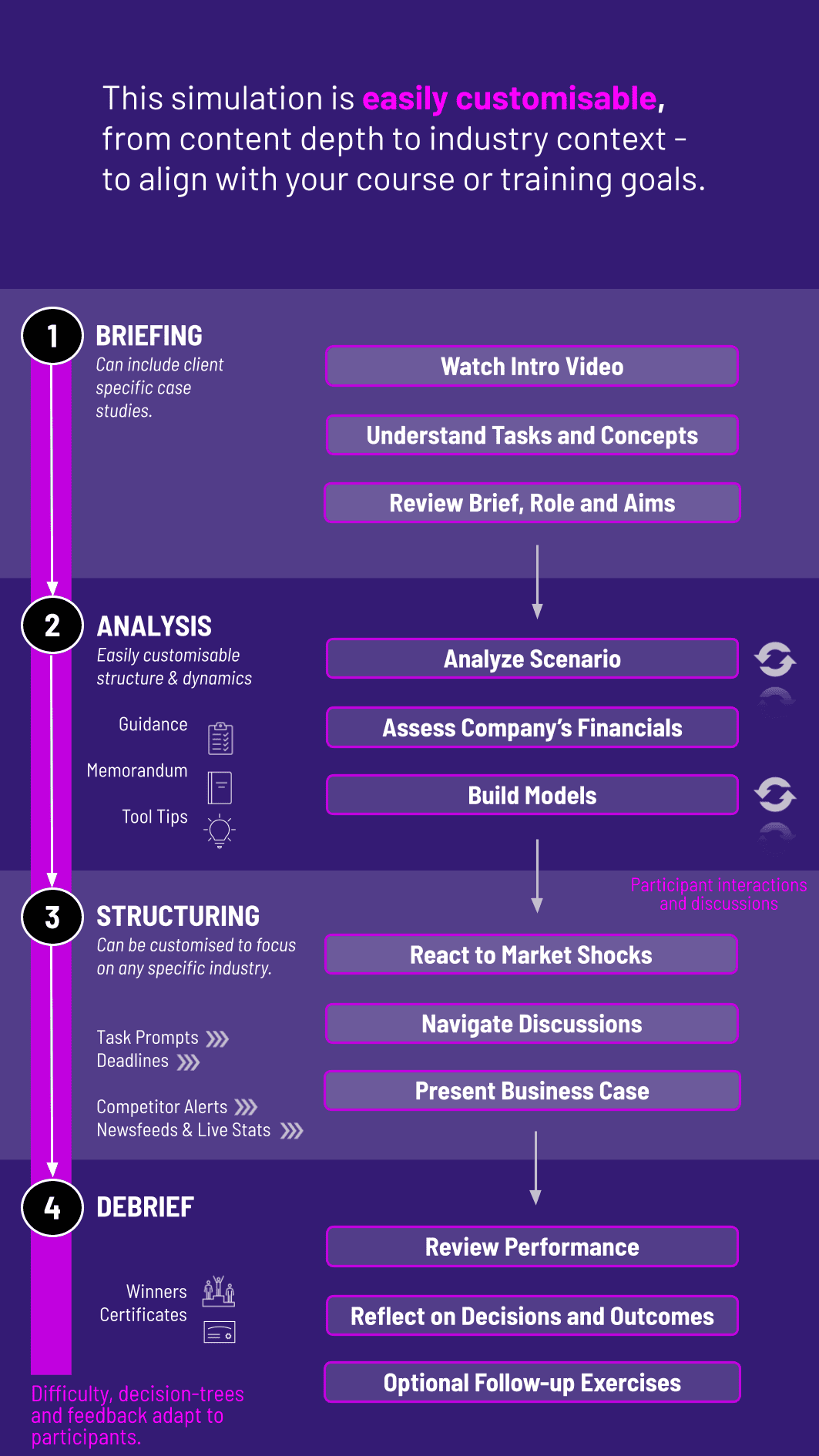 6. Debrief and Learning Recap The facilitator leads a discussion on key takeaways, common pitfalls, and the application of concepts to the real world. This cycle repeats with increasingly complex scenarios.