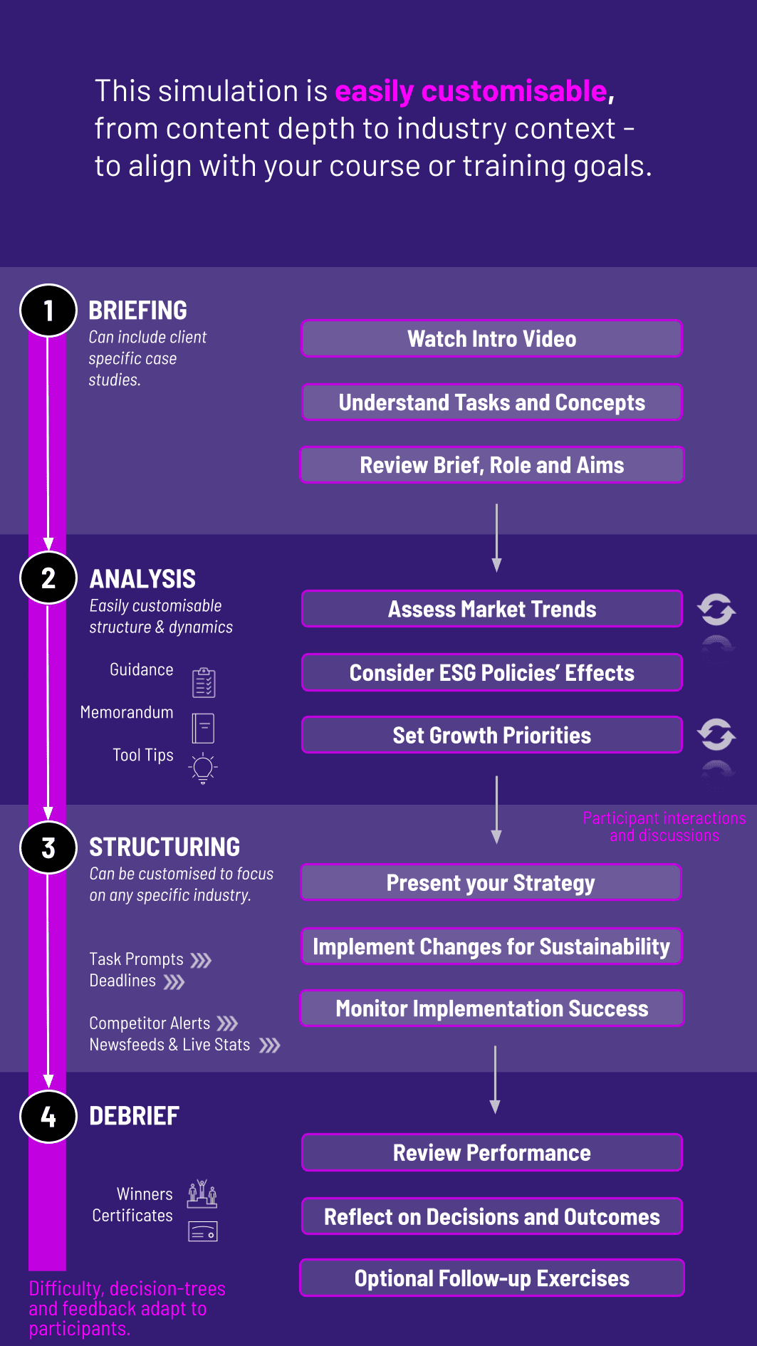 The simulation’s flexible structure ensures that these objectives can be calibrated to match the depth, duration, and focus areas of each program, whether in higher education or corporate learning.