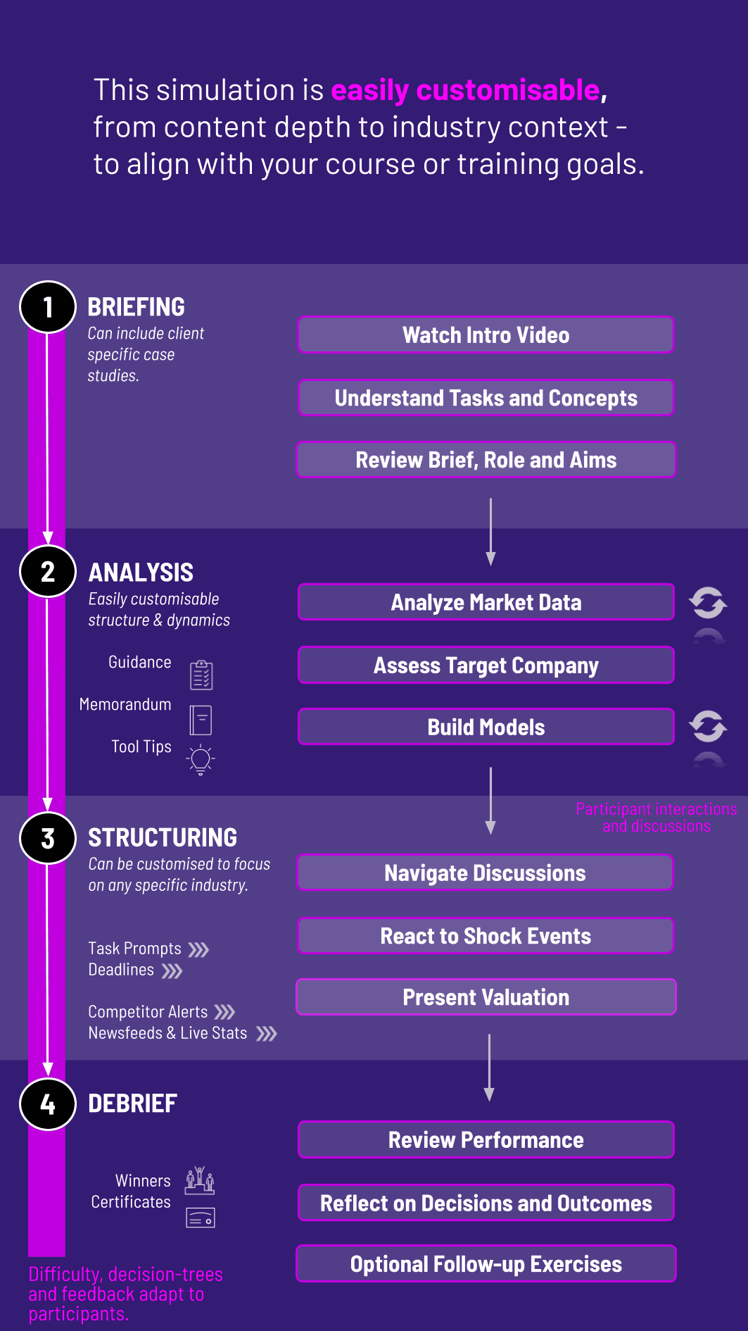 Can the simulation focus be customized for our course? Absolutely. The industry focus, complexity of financial adjustments, and specific valuation deliverables can be tailored to match your program's objectives.